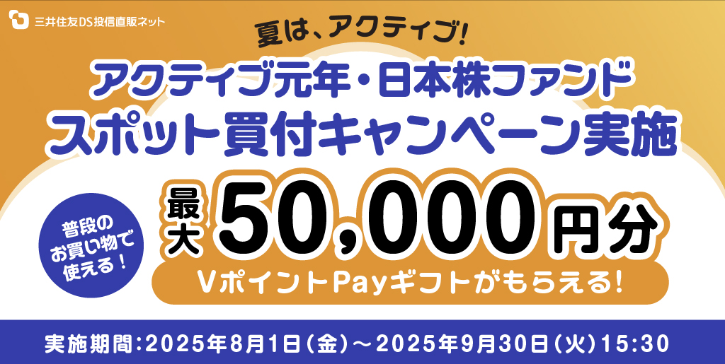2025年10月31日(金)15:30までに、三井住友DS投信直販ネットで対象ファンド「アクティブ元年・日本株ファンド」を合計10万円以上お買付いただいた方が対象です。※ 2