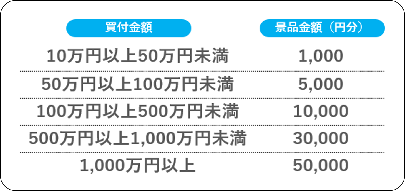 Ⅱ新規に口座を開設した方: ①キャンペーン期間内に三井住友DS投信直販ネットの口座開設のお申込みをしていただいた方 ②対象ファンド(「アクティブ元年・日本株ファンド」)を2025年10月31日(金)15:30までに三井住友DS投信直販ネットの口座で合計10万円以上お買付けいただいた方(定期積立プランによる買付金額は本キャンペーンの対象外です。) ③判定日(※2)までに対象ファンドの売却を一度も行わなかった方 ※ 1 プレゼントする景品金額は、投資金額により異なります。 ※ 2 判定日:2025年11月28日(金) ご注意 ・景品の進呈時期は2025年12月下旬頃を予定しております。