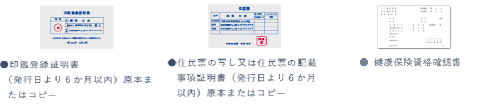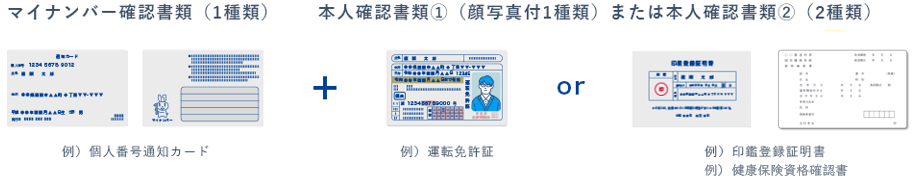 マイナンバー確認書類(提出が必ず必要)と本人確認書類①(1種類)または本人確認書類②(2種類)の提出が必要です。