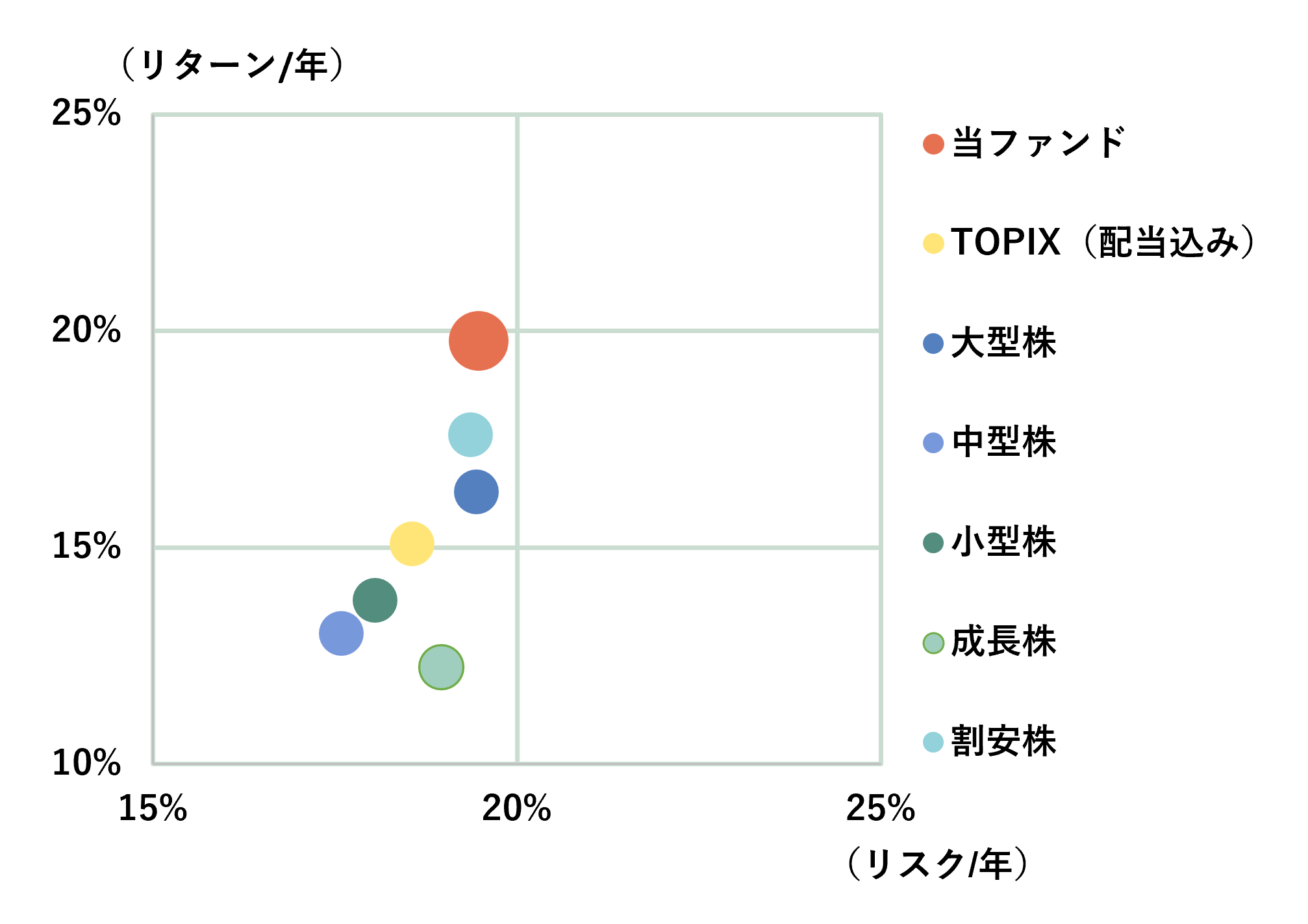 アクティブ元年・日本株ファンドのリスクは、TOPIX(配当込み)などに対してやや高めですが、より高いリターンを実現できたことによって、投資効率(年率リターン÷年率リスク:取ったリスクに対して、どのぐらいのリターンをあげてきたかを表す。数値が大きいほど投資効率が高いといえる)は、TOPIX(配当込み)に加え、規模別やスタイル別の指数に対しても高くなっていますので、効率よく運用できていることを示しています。アクティブ運用の価値をここまではしっかりと示せていると思います。